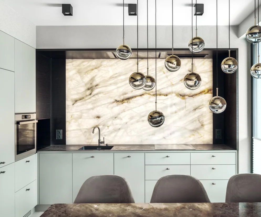 Oryginalną ozdobą wnętrza jest kuchenna ściana wykończona podświetlanym kamieniem. To onyks specjalnie sprowadzany z Pakistanu. Wpasowany w czarną ramę zabudowy kuchennej przypomina obraz namalowany przez samą naturę. Projektantkom zależało, by był biały i nie miał żółtych przebarwień, stąd jego podróż z tak dalekich regionów.