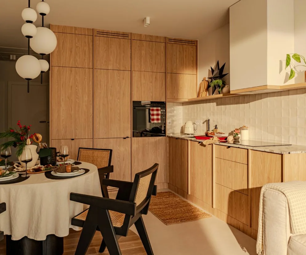 — Tu przeplatają się dwie filozofie. Duńskie hygge, szczęście płynące z przebywania w ciepłym, przyjaznym otoczeniu, płynnie łączy się z koncepcją „less is more”. Blask światełek i bogatych ozdób zastąpiły proste świąteczne akcenty, naturalne materiały i subtelne dodatki oraz… łagodne, zimowe słońce wypełniające wnętrze — wyjaśnia.