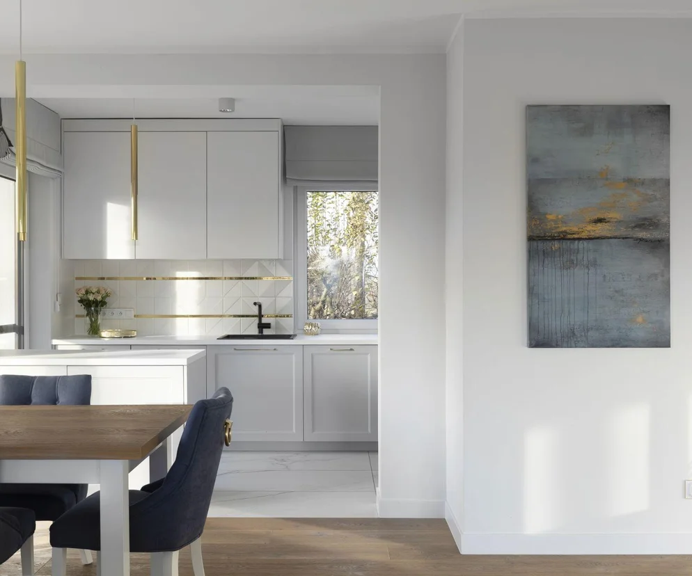 W białej kuchni wzrok przyciąga zabudowa z czarnymi i złotymi detalami. Szczególne wrażenie robi ściana wyłożona trójwymiarowymi płytkami przeciętymi złotymi liniami. Chociaż nie widać tego na pierwszy rzut oka, jest tu i spiżarnia. Schowano ją za frontami meblowymi.