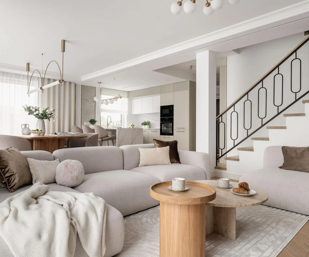 Lustra natomiast optycznie powiększają przestrzeń, dodając jej wizualnej przestronności. Uzupełnieniem całości jest klasyczny duet kolorystyczny: drewno w ciepłym odcieniu i kaszmir.