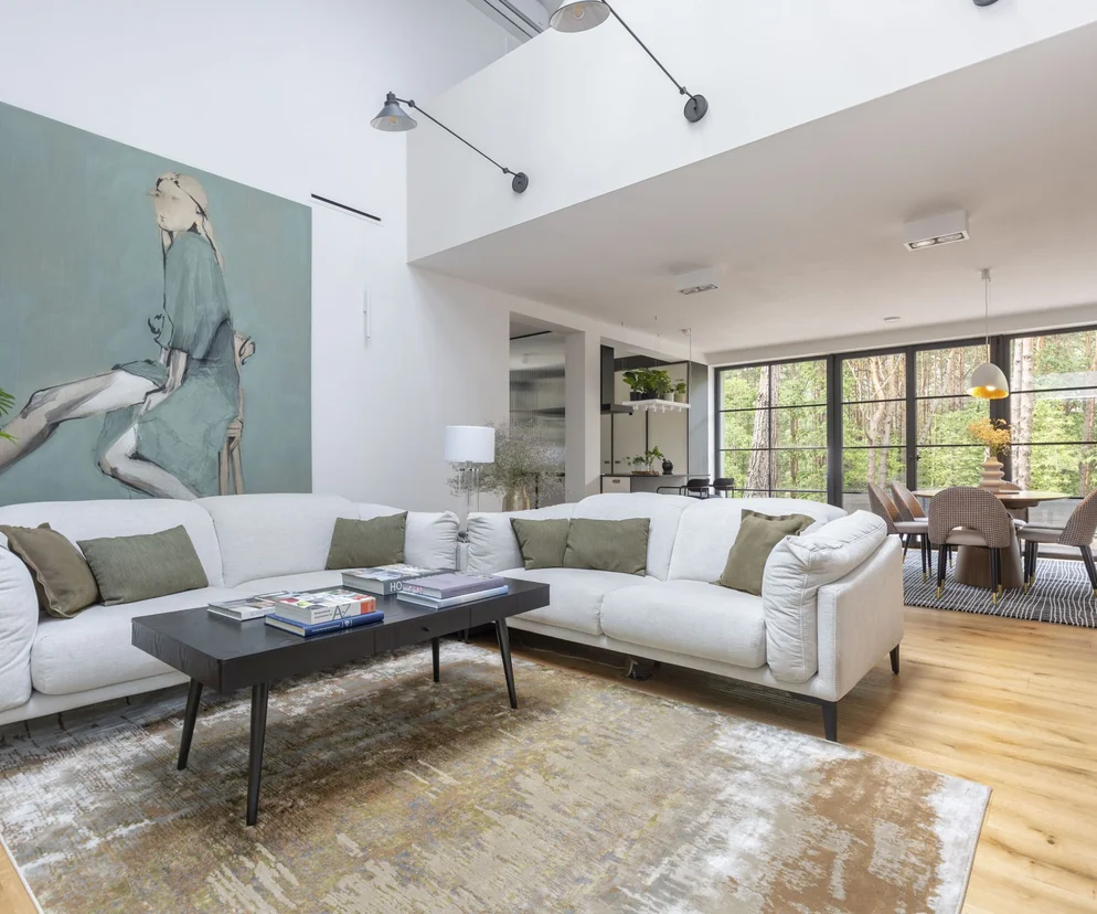 Klimatyczna przestrzeń, zarówno reprezentacyjnej strefy dziennej z salonem o wysokości dwóch kondygnacji, jak i części prywatnej, ujmuje spójną stylistyką. Industrialne akcenty, nowoczesne, eleganckie formy mebli oraz dopełniające całości obrazy i grafiki ścienne składają się na to wyjątkowe wnętrze.