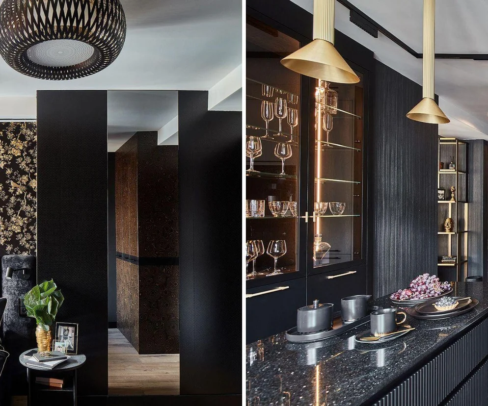 Chociaż zarówno zabudowy, jak i cała stolarka są czarne, to wystarczyło podbić ich barwę fakturami oraz materiałami. Gdy dodatkowo połączono kolor ten ze złotem, uzyskano luksusowy efekt. Lekkości całej aranżacji dodały tapety, naturalny kamień, skóra oraz drewno, którym pokryto podłogę.